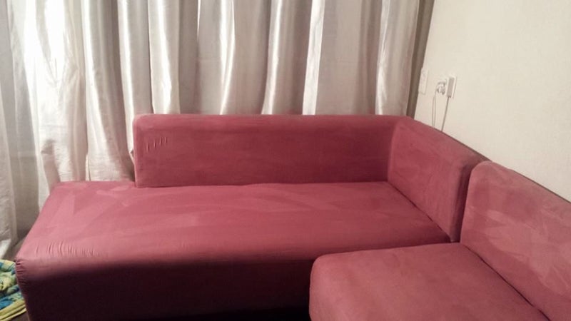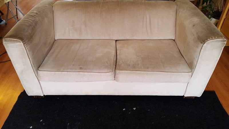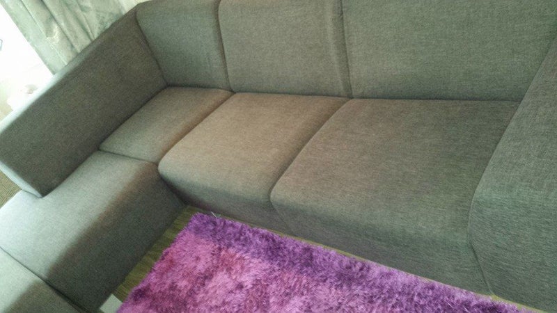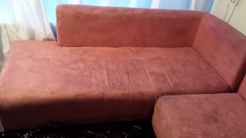 Een mooie simpele hoekbank waar flink op geleefd zoals het hoort natuurlijk, de kinderen en katten hebben er een hele boel vlekken achter gelaten, mevrouw heeft met verschillende vlekkenreinigers de vlekken geprobeerd te verwijderen maar zonder resultaat.